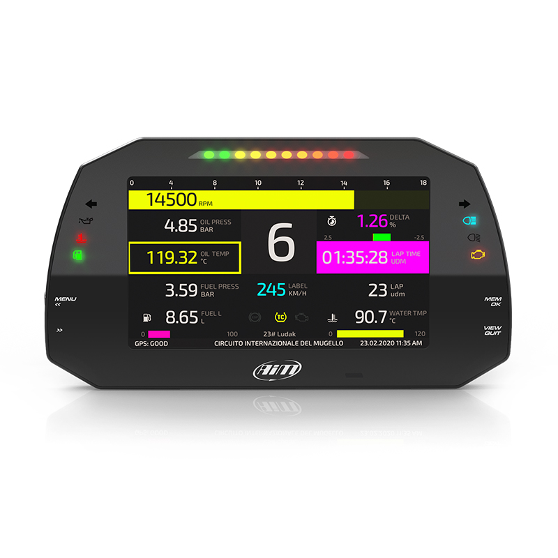 AiM dashes and dash loggers are designed to acquire and display data coming from your ECU, as well as from the GPS09c included in the kit (dash loggers version only), analog/digital inputs and predefined math channels. Performance and data acquired can also be increased adding up to eight expansion modules.