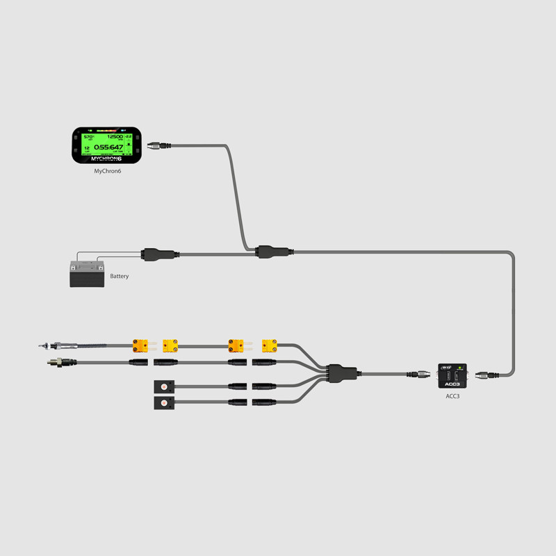 Il Cablaggio Split (Split Harness) è progettato per interconnettere il MyChron 6 con dispositivi periferici esterni e con i moduli ACC3/ACC3 Open, fornendo alimentazione autonoma tramite batteria e supportando l'integrazione di numerosi componenti aggiuntivi (add-on).